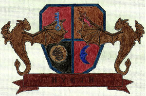 You notice the shield above your head as you walk into the rather small, but comfortable room. The two brown dragons on the side sparkle slightly from the light of the flames lighting your way. Strangely there is another doorway at the back of the small cave, along the right wall. Before you get a chance to look inside, you hear a voice behind you.